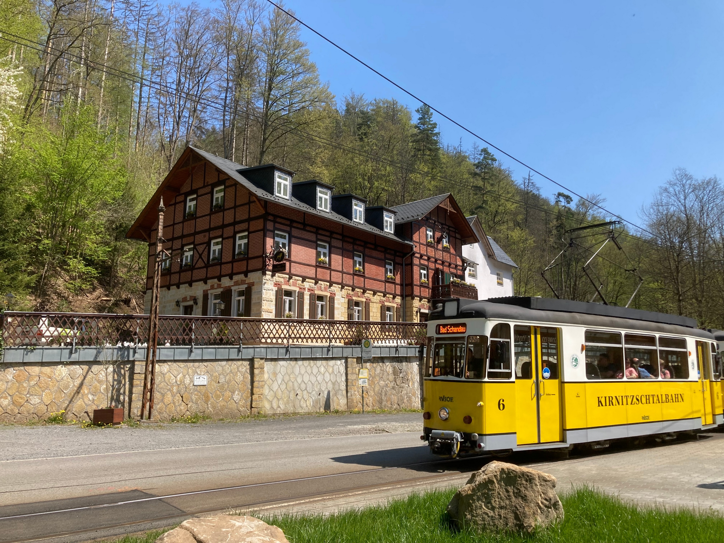 Sein Wahrzeichen ist die Kirnitzschtalbahn: eine kleine Straßenbahn, die seit über hundert Jahren die Besucher von Bad Schandau zum Lichtenhainer Wasserfall bringt.